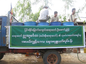 ကြၽန္မႏွင့္ မပန္းကဗ်ာကေတာ့ ကင္မရာေလး တစ္လံုး ကိုင္ျပီး ေသာက္သံုးေရ ကို အားကိုးတၾကီးလာေရာက္ အလွဴခံၾကတဲ့ ေက်းရြာေန လူထုကို အေတြ႕အၾကံဳမ်ားေမးျမန္းရင္း....မွတ္တမ္း ဓာတ္ပံုမ်ားကို ရိုက္ယူျဖစ္ခဲ့ပါတယ္။ေရမကူးတတ္ပဲ ပင္လယ္ျပင္ခရီးကို လိုက္ပါခဲ့တဲ့ ကြၽန္မတို႕၂ေယာက္ဟာ ေရေပးေ၀ျခင္းကို ကူညီဖို႕ေနေနသာသာ အက်ိဳးေဆာင္အဖဲြ႕ကေတာင္ ကြၽန္မတို႕ နွစ္ေယာက္ကို. . . . ျပန္လည္ေစာင့္ေရွာက္ေနရပါတယ္. . . . အက်ိဳးေဆာင္ အဖဲြ႕က အမတို႕ေရွ႕ရြာေတြ ေရာက္ရင္ ေရ(၁၀) ဂါလံ တစ္ပံုးဆီသယ္ရမယ္လို႕ ေနာက္ပါတယ္. . . . .ကြၽန္မတို႕ကလည္း ရပါတယ္ ဒီပံုးေလာက္ ကေအးေဆး ေရတိုင္ကီ အျပည့္နဲ႕ သယ္ေပးမယ္လို႕ ျပန္ေနာက္ျဖစ္ခဲ့ပါတယ္. . .ညေန ၄:၃၀နာရီ မွာေတာ့ ေရွ႕ဆက္ေရေ၀ေပးရမယ့္ ၿမိဳ႕ေတြကို ဆက္လက္ထြက္ခြာခဲ့ပါတယ္။